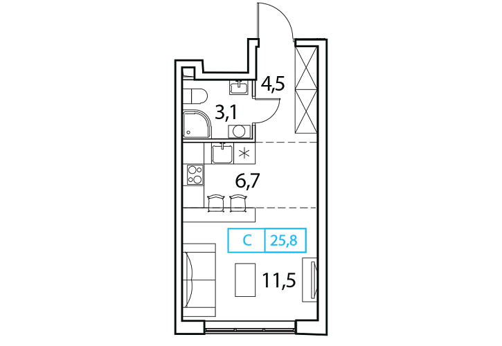 - Общая площадь: 25.8м2