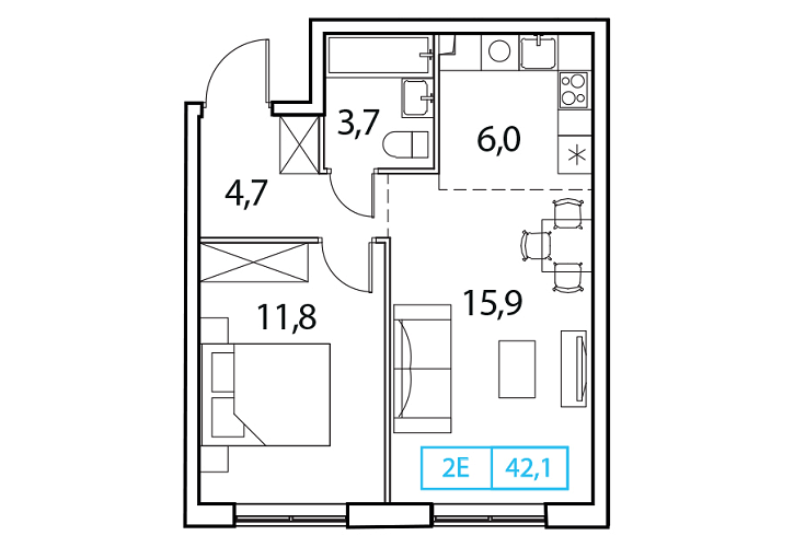 • Общая площадь: 42.1м2