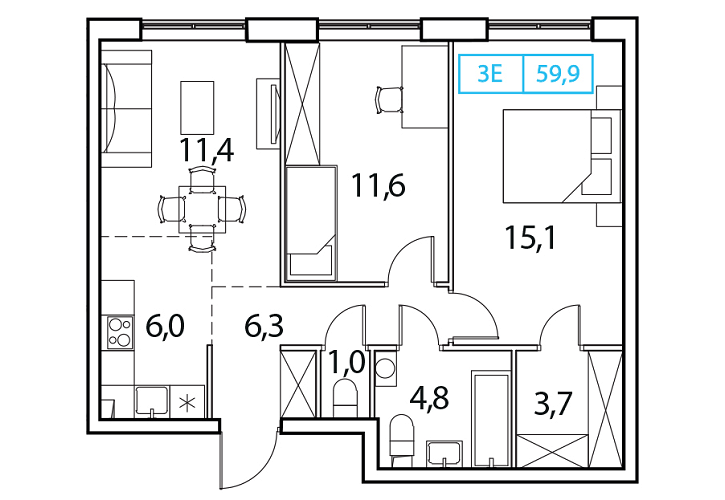 • Общая площадь: 59.9м2