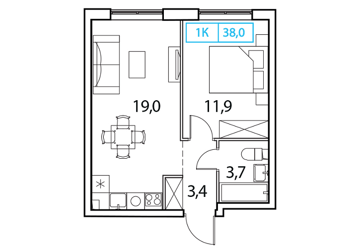 1-комнатная квартира 38 м2 № 182, корпус 2А