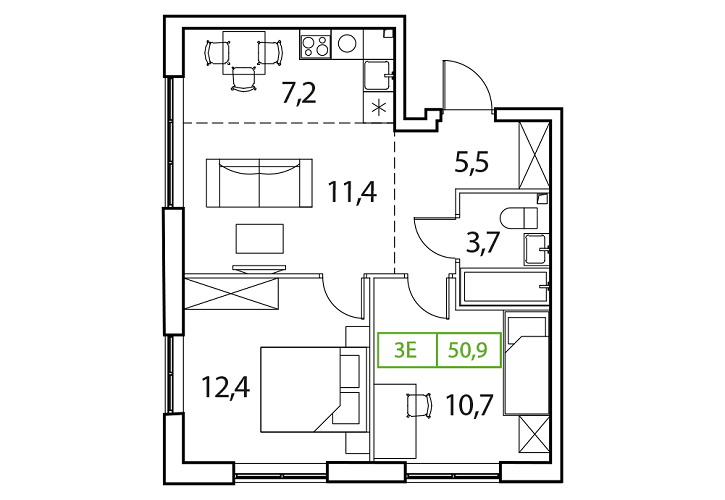 • Общая площадь: 50.9м2