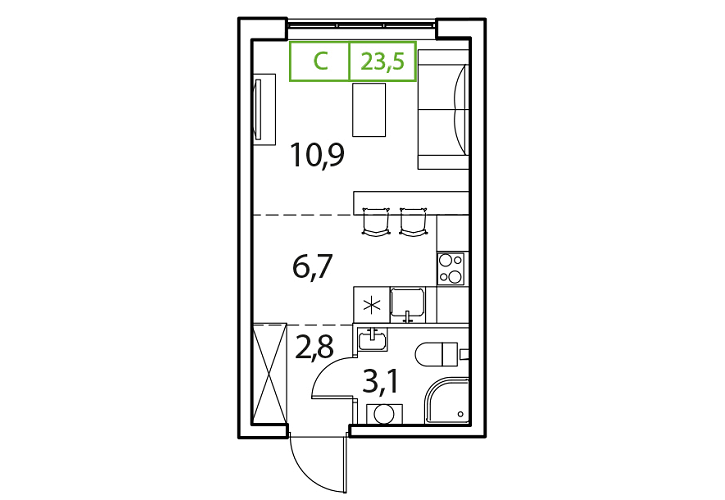 - Общая площадь: 23.5м2