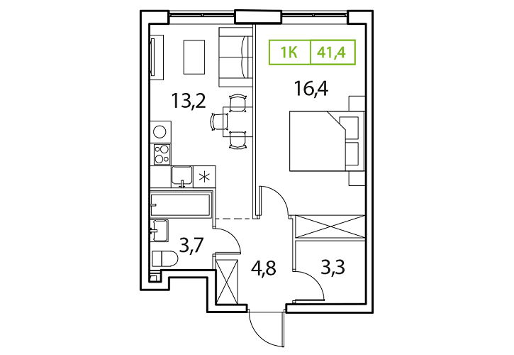 - Общая площадь: 41.4м2