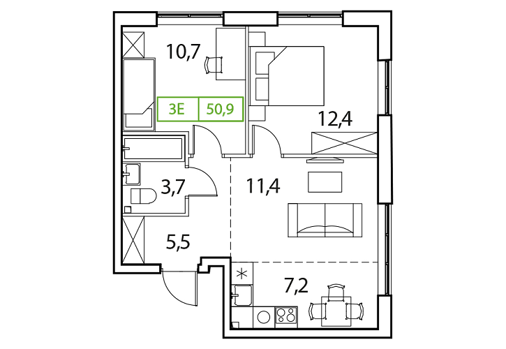 - Общая площадь: 50.9м2