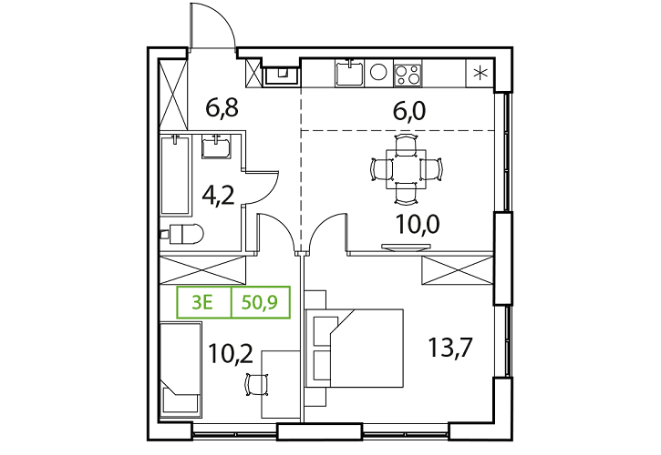 • Общая площадь: 50.9м2