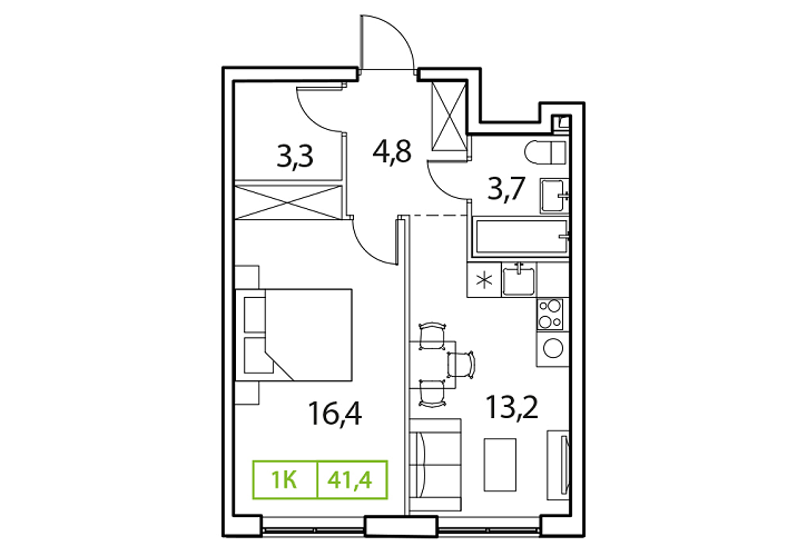 1-комнатная квартира 41.4 м2 № 406, корпус 2Б