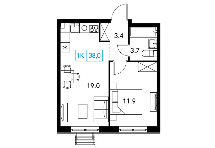 - Общая площадь: 38м2
