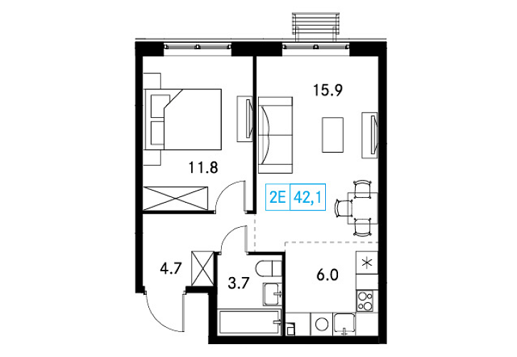 - Общая площадь: 42.1м2