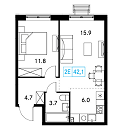 - Общая площадь: 41.6м2