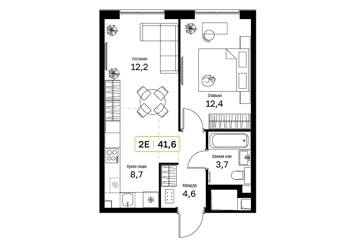 • Общая площадь: 41.6м2
