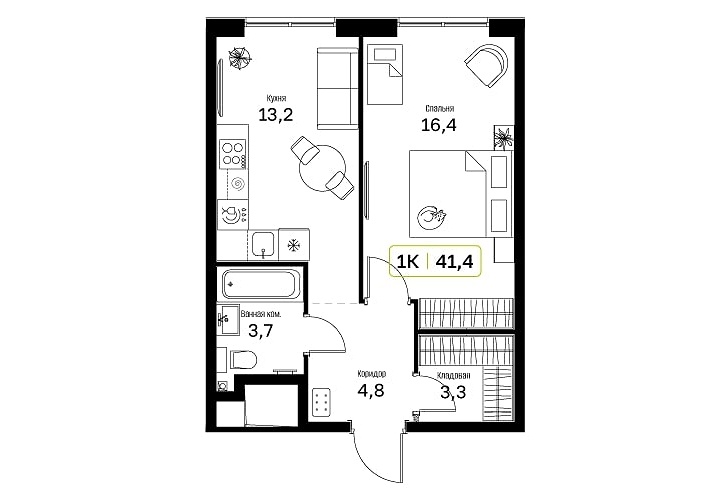 - Общая площадь: 41.4м2
