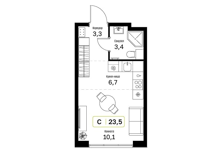 - Общая площадь: 23.5м2
