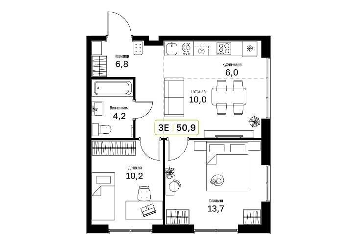 • Общая площадь: 50.9м2