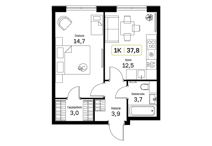 1-комнатная квартира 37.8 м2 № 393, корпус 5