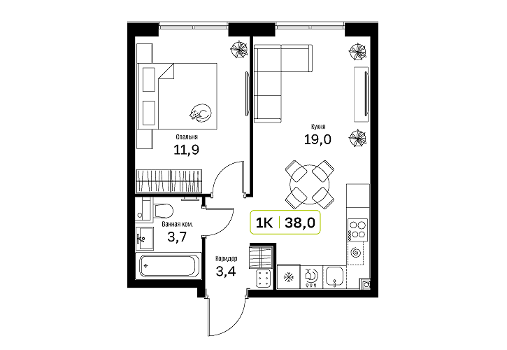 • Общая площадь: 38м2