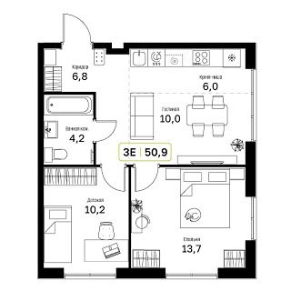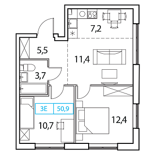- Общая площадь: 50.9