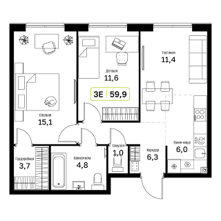 - Общая площадь: 59.9