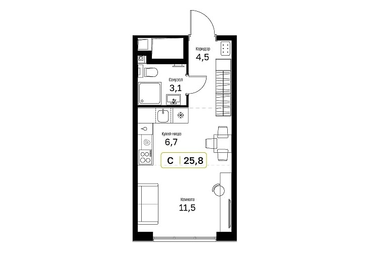Общая площадь квартиры составляет 25.8 м², а жилая площадь — 11.5 м². Кухня площадью 6.7 м² идеально подходит для повседневного использования.